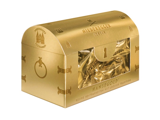 宝箱のようなパッケージが楽しい ニーダーエッガー ゴールド トレジャーボックス は、マジパンの老舗ニーダーエッガーの上質なマジパンを高級ダークチョコレートでコーティング。個包装15個入り。プレゼントにも最適。