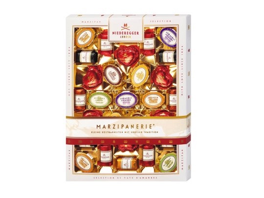 さまざまな味が楽しめる、ニーダーエッガー マジパネリー は、マジパンの老舗ニーダーエッガーの上質なマジパンと、高級チョコレート、いろいろなナッツやフルーツで作られた、バラエティセレクション。高級感あるパッケージで、プレゼントにも最適。