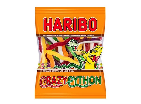 Haribo Crazy Python are long fruit gum snakes in 6 different flavors: amazing apple, crazy coke, lucky lemon, paradise peach, royal raspberry and splashy strawberry.